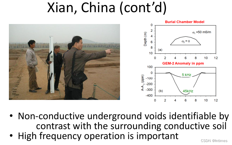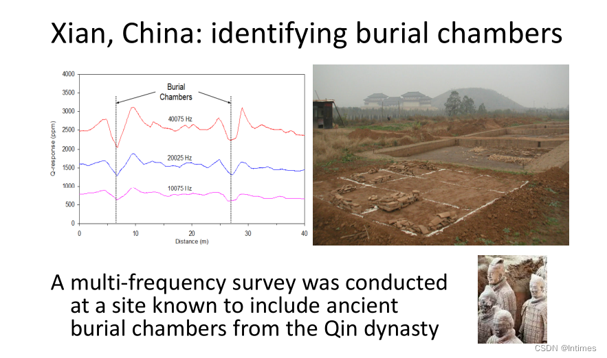 在中国的西安,对地下埋藏的洞室进行了识别,使用了多个频率对一处被认为是秦代的古代洞室进行了探测。曲线也显示了洞室的位置。