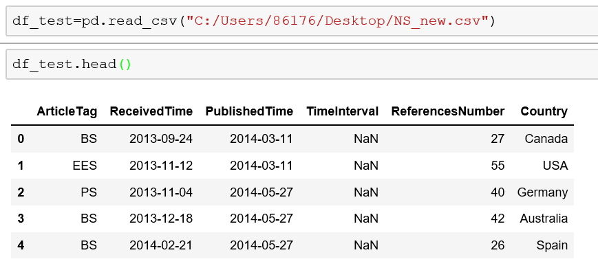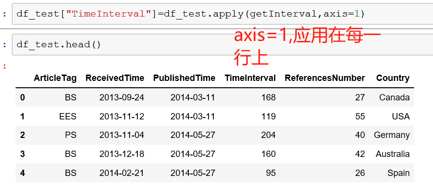 def dataInterval(data1,data2):d1 = datetime.datetime.strptime(data1, '%Y-%m-%d')d2 = datetime.datetime.strptime(data2, '%Y-%m-%d')delta = d1 - d2return delta.daysdef getInterval(arrLike): #用来计算日期间隔天数的调用的函数PublishedTime = arrLike['PublishedTime']ReceivedTime = arrLike['ReceivedTime']days = dataInterval(PublishedTime.strip(),ReceivedTime.strip()) #注意去掉两端空白return days
