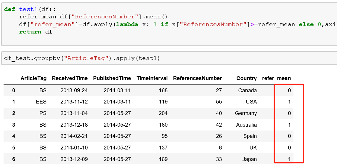 这里我们还是使用上面的数据,但是我们想让每类文章中参考次数大于平均值的为1,小于平均值的为0,那如何来操作呢?