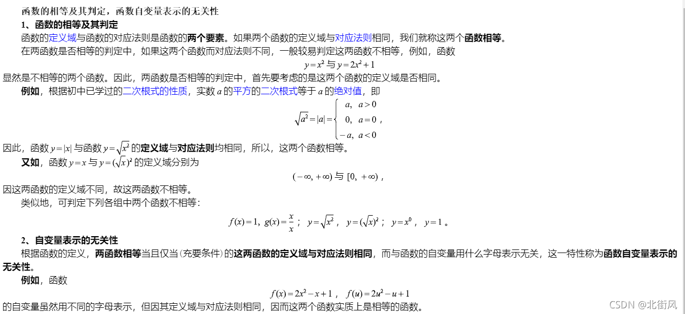 注1:函数的定义域与对应法则称为函数的两个要素。两函数相等的充要条件是其定义域与对应法则相同,而函数的自变量用什么字母表示无关,此即函数自变量表示的无关性。