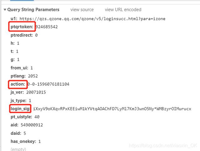 经过反复抓包测试,发现所需要的不定参数:ptqrtoken,action,login_sig。一眼就可以看出action是一个时间戳拼接字段,而其他的两个字段应该是进入页面请求时候设置的cookie值,通过全局搜索字段发现login_sig就是登陆页面的pt_login_sig。