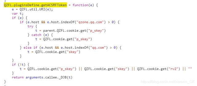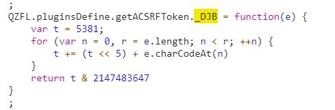 uin,rd,g_tk(接口需要两个,实际给一个就够了)三个字段在变化,其中uin就是用户的QQ号,rd是一个0-1之间的随机数,g_tk是一个加密后的数值,uin其实就在登陆之后的cookie的uin对应的值中,g_tk全局查找会在一个qzfl_v8_2.1.65.js文件中找到他,而这里面出现了大量的**“g_tk=” + QZFL.pluginsDefine.getACSRFToken(参数)**,于是就去找找看这个js函数到底做了什么: