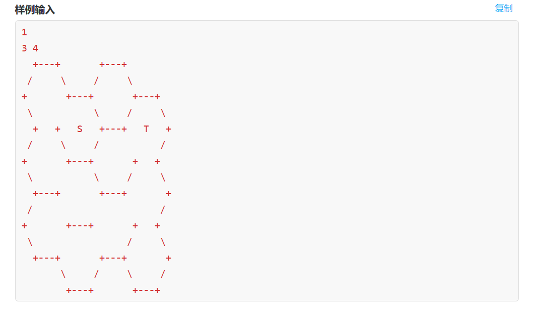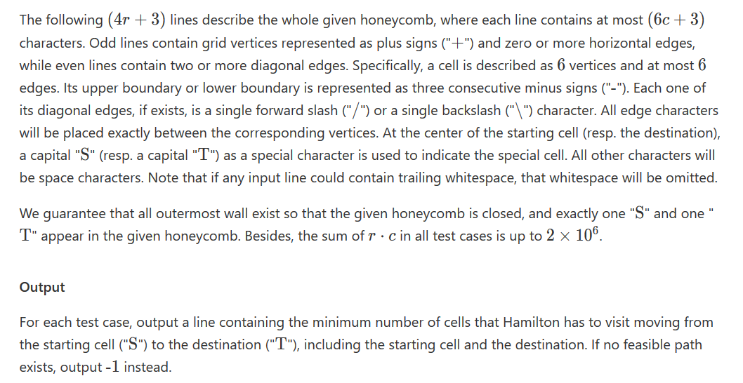 }node;void readmp(){cin>>r>>c;getchar();for(int i=0;i<4*r+3;i++)cin.getline(mp[i],7000);/*in>>r>>c;in.getline(mp[0],7000); //瞎jier吸收回车for(int i=0;i<4*r+3;i++){in.getline(mp[i],7000);}for(int i=0;i<4*r+3;i++){for(int j=0;jq;q.push({S,1});dp[S]=1;while(!q.empty()){int nowi=q.front().index ,nows=q.front().step;if(nowi==E) {ans=min(ans,nows);}q.pop();for(int i=0;i<(int)v[nowi].size();i++){if(nows+1>T;cin>>T;while(T--){ans=INT_MAX;readmp();initv();bfs();if(ans!=INT_MAX)cout<