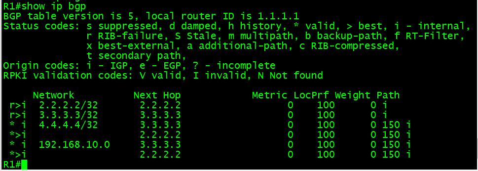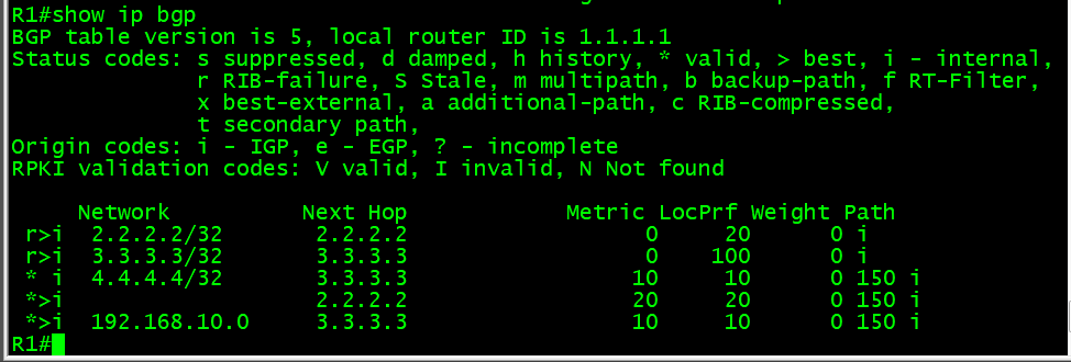 R2(config-router)#neighbor 1.1.1.1 next-hop-self #由于R2是EBGP,此命令仅限于在EBGP上面写,目的是给IBGP传路由