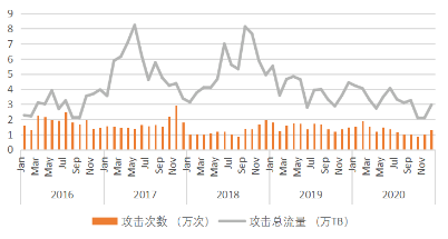 云堤我们统计了 2016 年至 2020 年的 DDoS 攻击次数和攻击流量,从历史趋势变化来看,在经历了