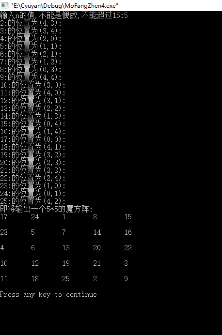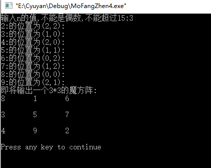 int main(){int arr[N][N] = {0};int x=0,y,s=1,i,j,n=2,oldx,oldy;//校验输入的是不是偶数或者是不是超过了15位while(n%2 == 0 || n > 15){printf("输入n的值,不能是偶数,不能超过15:");scanf("%d",&n); }//计算第一行中间的列值,并将1赋值到这个位置y=n/2;//对其赋值并记录其位置,用于下一个数的位置判断arr[x][y] = s;oldx = x;oldy = y;//从2 到 n*n进行循环,通过上一个值的地址寻找下一个值的地址 例如通过 数字 1 所在的地址 寻找2所在的地址for(s = 2;s <= n*n;s++){ //进行行减一列加一运算x = oldx - 1;y = oldy + 1;//判断特殊情况if(x < 0)//x越界x = n-1; //x越界就将x的位置重置为n-1if(y > n-1){//y越界y = 0;//y越界就将y重置为0}if(arr[x][y] != 0){//通过上面的条件判断arr[x][y]位置有数,那么就将新的数加到上个数的下面oldx + 1即可x = oldx+1;y = oldy;}printf("%d:的位置为(%d,%d):\n",s,x,y);//经过一些列的判断,一定能得出这个数的位置,我们只需要将s赋值到这个位置即可!//对其赋值并记录其位置,用于下一个数的位置判断arr[x][y] = s;oldx = x;oldy = y;}//循环输出魔方阵printf("即将输出一个%d*%d的魔方阵:\n",n,n);for(i = 0;i < n;i++){for(j = 0;j < n;j++){printf("%d\t",arr[i][j]);}printf("\n\n");}return 0;