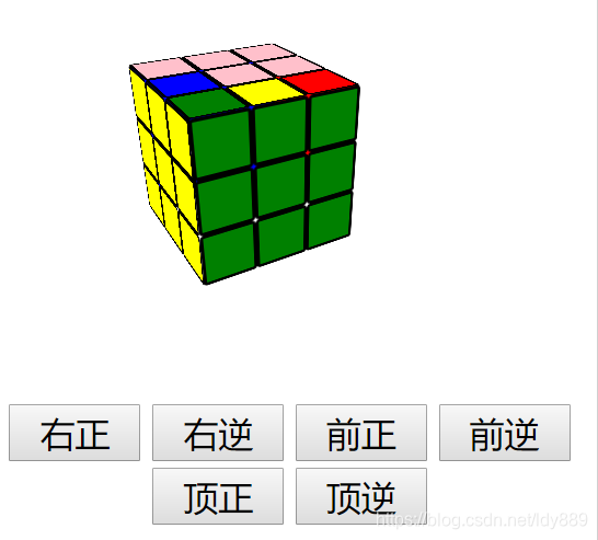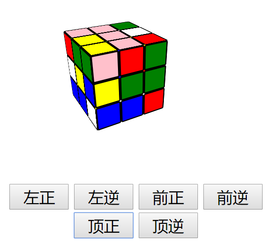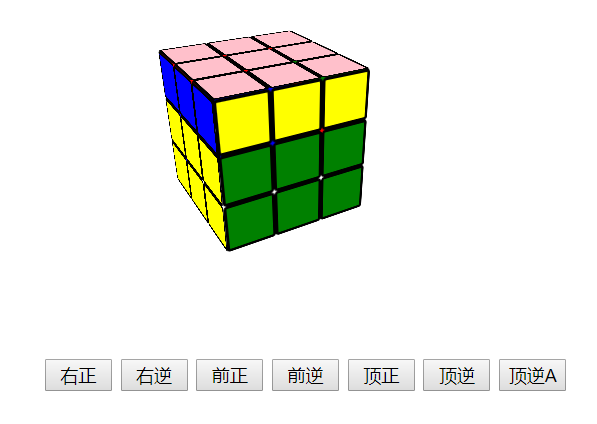 function dingni() { var rotefaces=['aside','bside','dside','cside']; //本次操作的4个相关面,一个顶面 var rotepos=[0,1,2]; //本次操作的块var movefave = "fside"; //本次操作的4个相关面,一个顶面 var bn = "36785210".split("");// 顶面的操作是这8个格子依次前进3次 "01258763"顺时针//为复制先存一个a面的顶上3个块颜色var tmpcolordata = []; for (var i = 0; i < rotepos.length; i++) {tmpcolordata.push(colordata[sidenames.indexOf(rotefaces[0])][i]); //保存第一个数据} for (var i = 0; i < rotefaces.length; i++) { //4个面轮流复制,最后一个面的时候使用保存的数据for (var j = 0; j < rotepos.length; j++) {if(i>=rotefaces.length-1){//c=acolordata[sidenames.indexOf(rotefaces[i])][j] = tmpcolordata[j]; }else{ //aside=bside,b=d,d=ccolordata[sidenames.indexOf(rotefaces[i])][j] = colordata[sidenames.indexOf(rotefaces[i+1])][j]; } }} //顶面旋转var ci = sidenames.indexOf(movefave); for (var i = 0; i < 2; i++) {var tmp = colordata[ci][bn[0]]; //保存第一个数据for (var j = 0; j < bn.length; j++) {if(j>=bn.length-1){colordata[ci][bn[j]]= tmp ; }else{colordata[ci][bn[j]]= colordata[ci][bn[j+1]] ; }} }//把数据对应到格子上 fillcolor2box(colordata); }//把数据对应到格子上function fillcolor2box(colordata) { sidenames.map(function(value,index,array) { var k= sidenames.indexOf(value);for (var i = 0; i < 9; i++) {$("."+value+" div").eq(i).css("background",colordata[k][i]);} });}