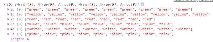 var sidenames = ["aside","bside","cside","dside","eside","fside"];var colordata=[];$(function (argument) { //六面赋值颜色sidenames.map(function(value,index,array) { $("."+value+" div").css("background",colors[index]);})//初始化colordata[]for (var i = 0; i < colors.length; i++) {var tmp =[];for (var j = 0; j < 9; j++) {tmp.push(colors[i]);}colordata.push(tmp);}console.log(colordata);