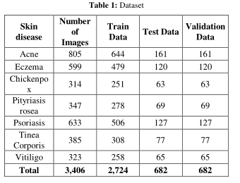 对数据集进行划分,对每一类皮肤病进行训练和测试。训练数据占数据集的80%,而测试数据占20%。验证数据收集在列车数据或测试数据中,与测试数据相比,图像数量相同,如表1所示。