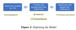 训练模型后,模型权重和体系结构可以用Keras文件扩展名。h5保存。为了将CNN模型正确地部署到Android应用程序中,.h5文件应该转换为一个文件扩展名为.pb的protobuff文件。在这个过程中,您需要冻结图形,生成一个.pb文件和一个包含已创建模型标签的txt文件。为了充分使用模型的推理,Tensorflow实用工具是使用的optimize_for_inference函数和这个模型可以成功加载到你的Android应用程序。图2显示了部署模型所需步骤的框图。