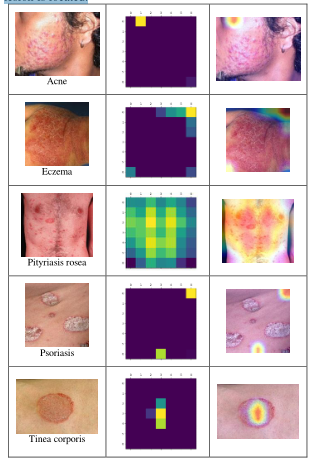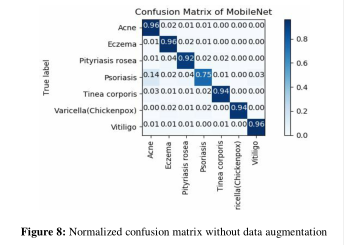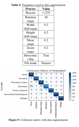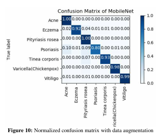 图9 - 10显示了使用数据增强和过采样技术的模型的混淆矩阵。尽管如此,这表明了系统是如何将大部分银屑病测试图像误分类为痤疮和玫瑰糠疹的,但从对银屑病的75%的准确率,准确率上升到80%,以及模型的排名1的准确率,现在是94.4%。表5显示了如何在皮肤病数据集上实现数据增强。