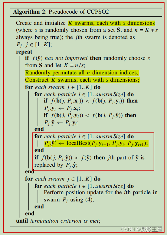 该篇论文还是基于CPSO_Sk算法改正而来的,但是采用了CCSPO中随机分组技术,但是去掉了gbest前的权重搜索策略(效果虽然杠杠的,但是本身值得商榷),CCPSO2采用了一种新的PSO位置更新规则,依靠柯西分布和高斯分布对搜索空间中的新点进行采样,并提出了一种动态确定子空间维度大小的方案。
