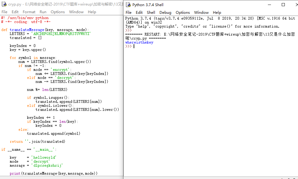 def translateMessage(key, message, mode):LETTERS = 'ABCDEFGHIJKLMNOPQRSTUVWXYZ'translated = []keyIndex = 0key = key.upper()for symbol in message:num = LETTERS.find(symbol.upper())if num != -1:if mode == 'encrypt':num += LETTERS.find(key[keyIndex])elif mode == 'decrypt':num -= LETTERS.find(key[keyIndex])num %= len(LETTERS)if symbol.isupper():translated.append(LETTERS[num])elif symbol.islower():translated.append(LETTERS[num].lower())keyIndex += 1if keyIndex == len(key):keyIndex = 0else:translated.append(symbol)return ''.join(translated)if __name__ == '__main__':key = 'helloworld'mode = 'decrypt'message = 'dlpcsegkshrij'print(translateMessage(key,message,mode))