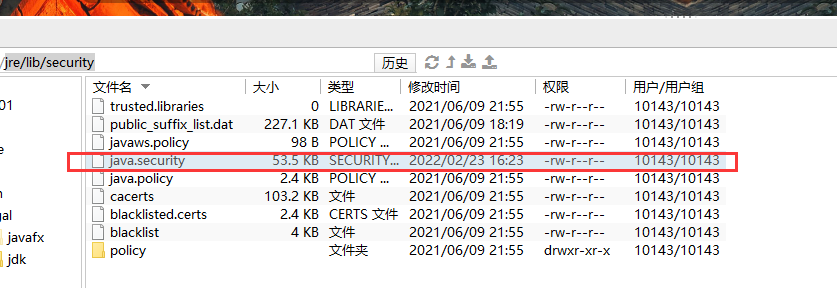 1,找到服务器中的jdk文件下的jre/lib/security文件(一般jdk位置,usr/local/java/jdk(版本号))