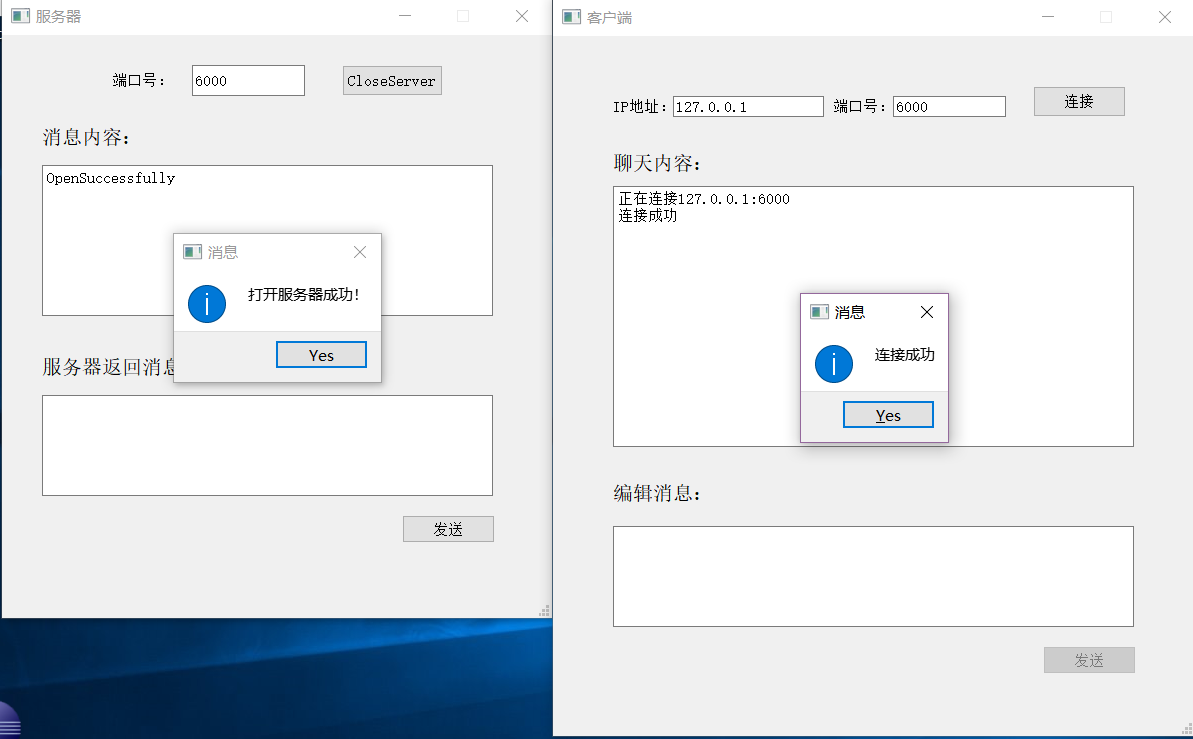 {if(ui->pushButton_Connect->text() == tr("连接")){QString IP;int port;//获取IP地址IP = ui->lineEdit_IP->text();//获取端口号port = ui->lineEdit_Port->text().toInt();ui->textEdit_Recv->setText("");ui->textEdit_Recv->insertPlainText("正在连接"+ui->lineEdit_IP->text()+":"+ui->lineEdit_Port->text()+"\n");//取消已有的连接socket->abort();//连接服务器socket->connectToHost(IP, port);//等待连接成功if(!socket->waitForConnected(30000)){QTextCodec::setCodecForLocale(QTextCodec::codecForName("GB18030"));QMessageBox::warning(this,tr("消息"),tr("连接失败!请重新连接"),QMessageBox::Yes);ui->textEdit_Recv->insertPlainText("连接失败\n");return;}ui->textEdit_Recv->insertPlainText("连接成功\n");QTextCodec::setCodecForLocale(QTextCodec::codecForName("GB18030"));QMessageBox::information(this,tr("消息"),tr("连接成功"),QMessageBox::Yes);//发送按键使能ui->pushButton_Send->setEnabled(true);//修改按键文字ui->pushButton_Connect->setText("断开连接");}else{//断开连接ui->textEdit_Recv->setText("断开连接\n");socket->disconnectFromHost();//修改按键文字ui->pushButton_Connect->setText("连接");ui->pushButton_Send->setEnabled(false);}