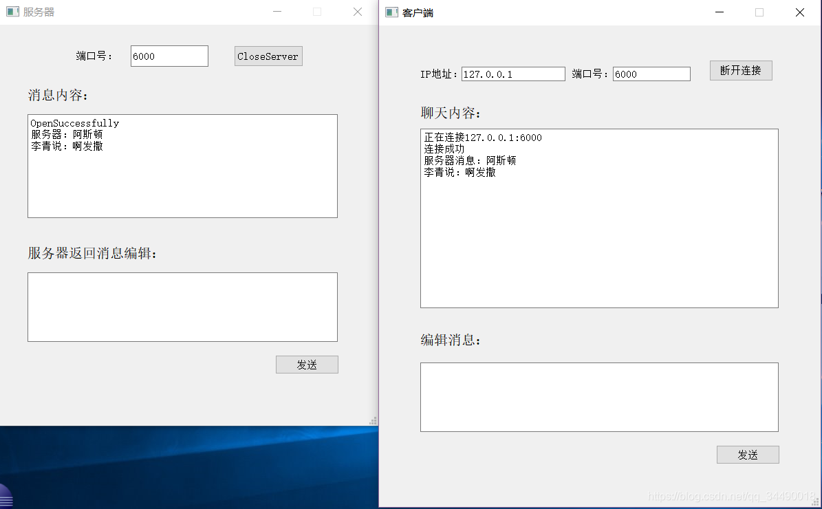 对于此程序的功能和界面在这进行一个简单的说明。首先服务器功能包括打开服务器(监听IP和端口)、接收显示客户端发送过来的消息、与客户端进行通信、在没有客户端接入的时候通过连接信号槽可以的得知且发送按钮失效。其次服务器功能包括通过输入IP地址和端口号进行连接服务器、接受显示服务器发送过来的消息、与服务器进行通信、同样在没有成功连接服务器的时候通过连接信号槽可以的得知且发送按钮失效。
