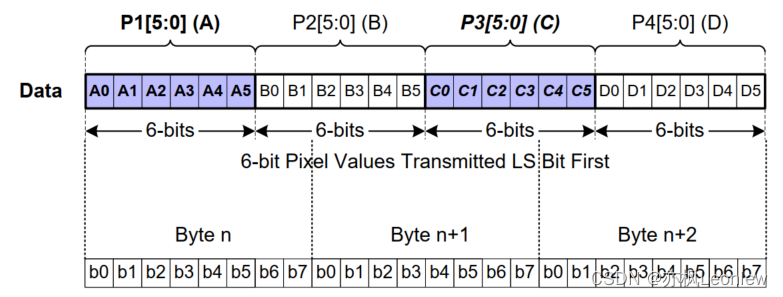 每6-bit的像素按照LSB优先方式发送。这和一般的CSI-2规则所采用的字节LSB优先的方式不同。见下图:
