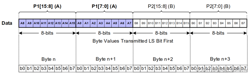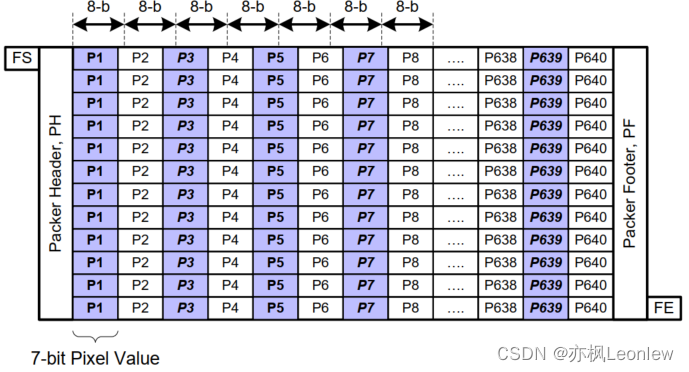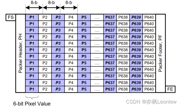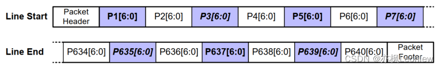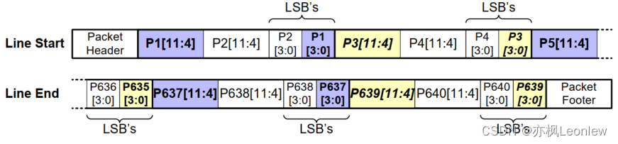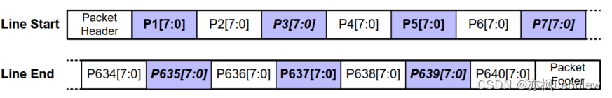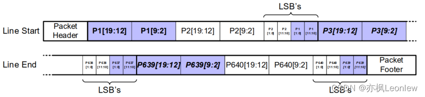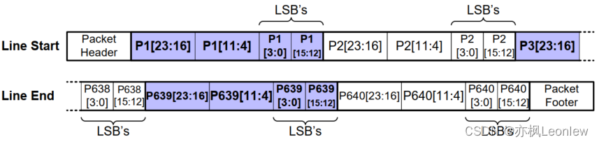 P1,P2,P3以及P3的LS bits分布在3个字节中。对于P637,P638,P639以及P640也是相同的规则。传输中的位序按照一般的CSI-2规则进行,LSB优先。如下图所示: