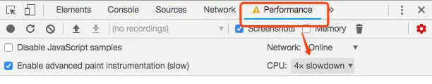 此外,我们还可以通过CSS Trigger15查询哪些属性会触发重排与重绘。 值得一提的是,某些CSS属性具有更好的重排性能。如使用Flex时,比使用inline-block和float时重排更快,所以在布局时可以优先考虑Flex。 3.2 避免不必要的重绘 当元素的外观(如color,background,visibility等属性)发生改变时,会触发重绘。在网站的使用过程中,重绘是无法避免的。不过,浏览器对此做了优化,它会将多次的重排、重绘操作合并为一次执行。不过我们仍需要避免不必要的重绘,如页面滚动时触发的hover事件,可以在滚动的时候禁用hover事件,这样页面在滚动时会更加流畅。 此外,我们编写的CSS中动画相关的代码越来越多,我们已经习惯于使用动画来提升用户体验。我们在编写动画时,也应当参考上述内容,减少重绘重排的触发。除此之外我们还可以通过硬件加速16和will-change17来提升动画性能,本文不对此展开详细介绍,感兴趣的小伙伴可以点击链接进行查看。 最后需要注意的是,用户的设备可能并没有想象中的那么好,至少不会有我们的开发机器那么好。我们可以借助Chrome的开发者工具进行CPU降速,然后再进行相关的测试,降速方法如下图所示。