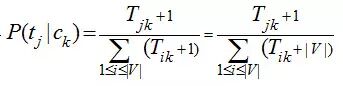 然后需要注意的一个问题是ti可能没有出现在ck类别的训练集,却出现在ck类别的测试集合中,这样因为Tik为0,导致连乘概率值都为0,其他特征词出现得再多,该文档也不会被分到ck类别,而且在对数累加的情况下,0值导致计算错误,处理这种问题的方法是采样加1平滑,即认为每个词在各个类别中都至少出现过一次,即