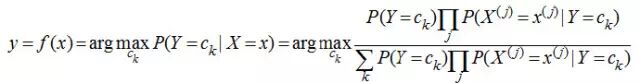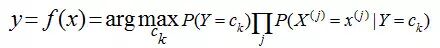 当特征为为x时,计算所有类别的条件概率,选取条件概率最大的类别作为待分类的类别。由于上公式的分母对每个类别都是一样的,因此计算时可以不考虑分母,即