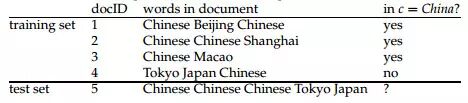 现在要计算docID为5的测试文档是否属于China类别,首先计算个各类的概率,P(c=China)=3/4,P(c!=China)=1/4,然后计算各个类中词项的概率: