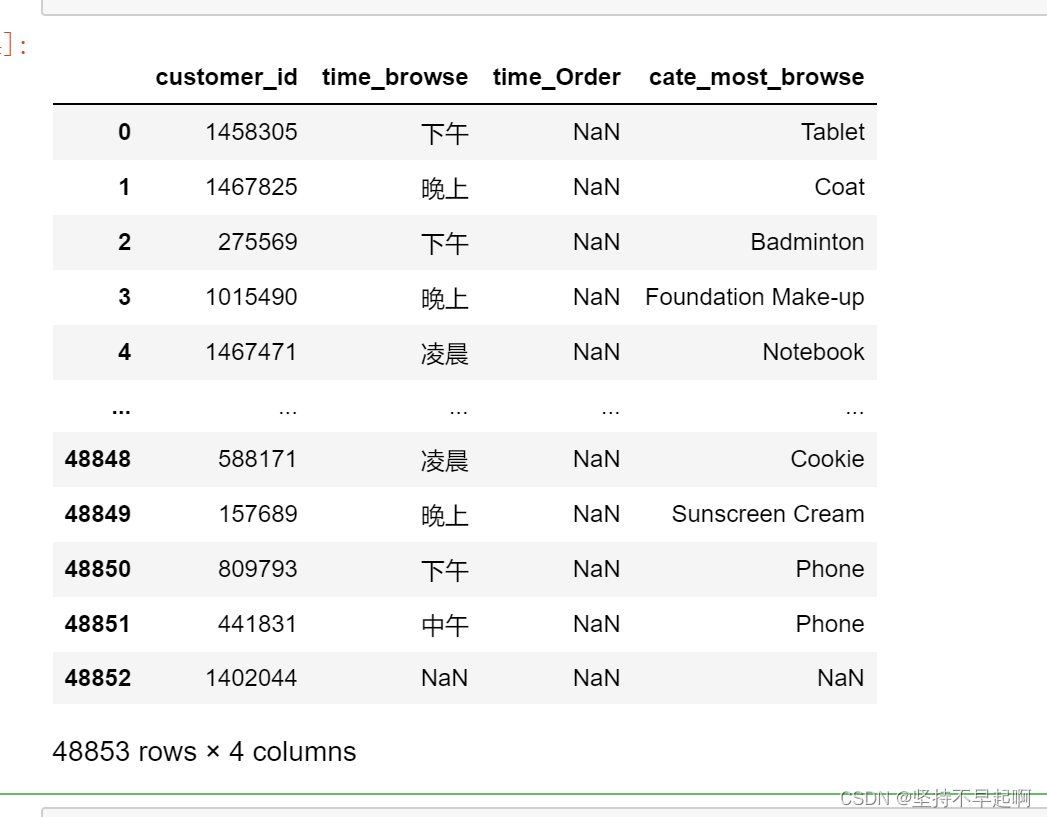 | 4 | 992362 | 凌晨 | NaN | Digital Camera | NaN | NaN | NaN | NaN | NaN | 1.0 | NaN | NaN | 1.0 | 14.0 | NaN | NaN | NaN | 是 | 是 | 未购买 |