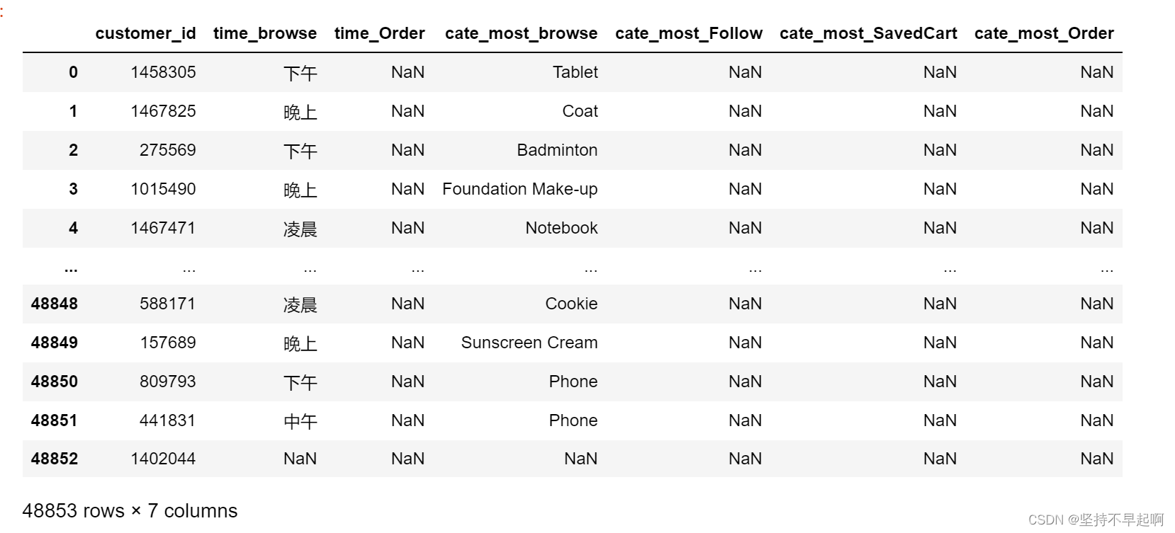| customer_id | time_browse | time_Order | cate_most_browse | cate_most_Follow | cate_most_SavedCart | cate_most_Order | month_buy | month_Cart | month_active | ... | week_Cart | week_active | last_browse | last_SavedCart | last_Orger | interval_buy | browse_not_buy | cart_not_buy_x | cart_not_buy_y | cart_not_buy | |