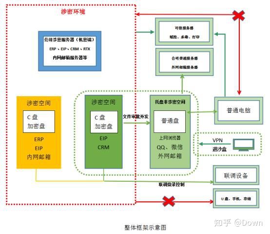 红区:主力产品、关键技术、核心代码等关键信息项目部门或产品部门,有独立的网络环境,专属的服务器,通过虚拟桌面办公,文件到黄区与绿区已实现严格的文档输出管控,无需再重复进行文档安全管控;