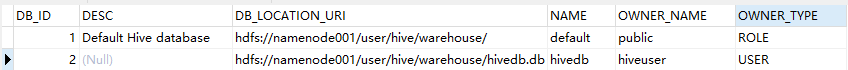 | DB_LOCATION_URI | varchar | 4000 | 数据库HDFS路径 |
