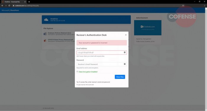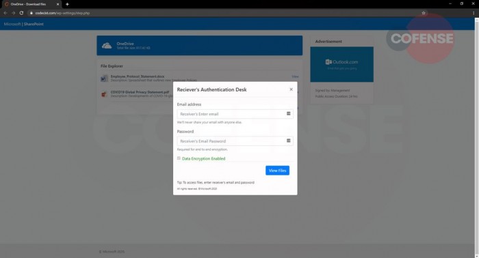 点击任何一个文件都会产生一个登录面板,提示收件人提供登录凭证以访问文件。这在大多数微软钓鱼网页中是不常见的,在这些网页中,欺骗微软登录屏幕的策略会打开一个认证器面板。通过让文件看起来是真实的,而不是重定向到另一个登录页面,用户可能更有可能提供他们的凭证以查看更新。