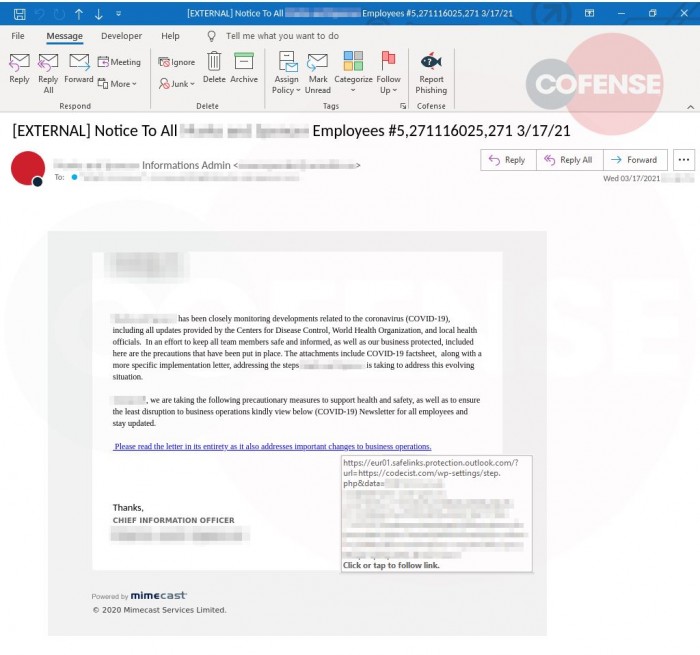 通过伪装成为公司高管,黑客会发送了一份虚假的通讯,解释了该公司针对大流行病采取的新的预防措施和业务运营的变化。在新冠疫情期间,很多公司都会对他们的业务进行调整,并为他们的员工提供指导。然而,在这种情况下,威胁者正试图利用有时令人困惑的变化来窃取凭证和个人信息。