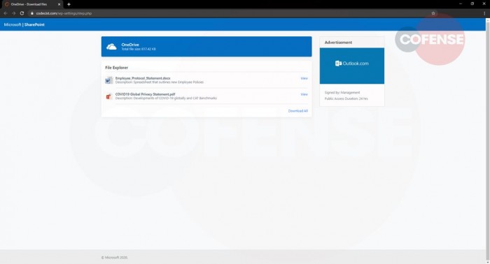 如果员工误信了这封电子邮件,他们就会被转到一个看似微软 SharePoint 的页面,其中有两个文件。这些文件看起来是合法的,概述了原始电子邮件中提到的业务操作的变化。这个额外的步骤不是简单地重定向到一个登录页面,而是增加了攻击的深度,让人觉得它们是来自公司内部的实际文件。当与这些文件互动时,就会发现它们不是真实的,而是用来获取账户凭证的网络钓鱼机制。
