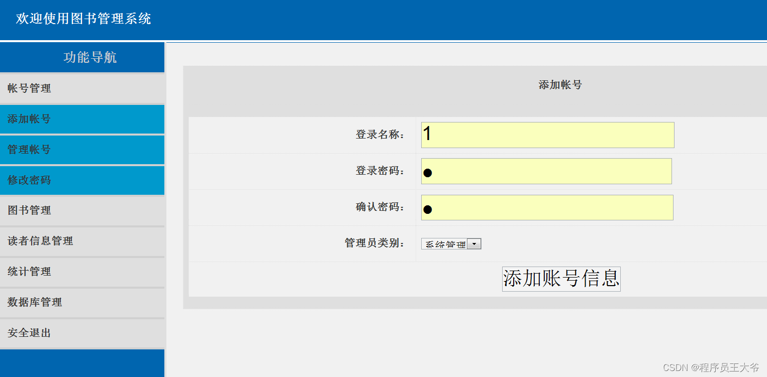 系统管理员功能:登录、系统账号管理(增加、修改、删除)、图书类别管理(增加、修改、删除)、图书信息管理(增加、修改、删除、查询)、读者信息管理(增加、修改、删除)、借阅统计、数据备份。