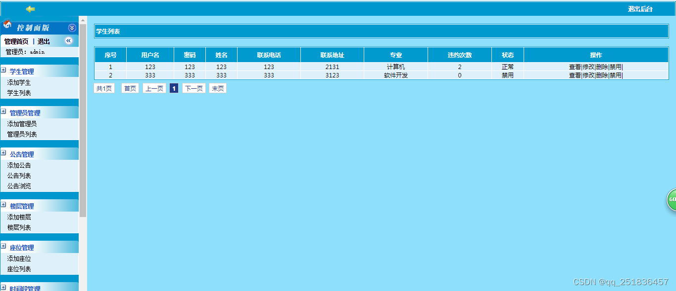 (1)学生管理:对学生信息进行添加、删除、修改和查看,禁用