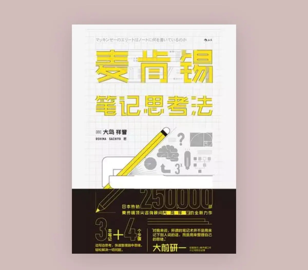 《麦肯锡笔记思考法》通过3种笔记(横线笔记、方格笔记、麦肯锡笔记),4个步骤(定义问题的笔记、建立解决方案假设的笔记、制作资料和发表成果的笔记、验证假设的笔记),教会我们记笔记不是为了记录别人说过的话,而是为了从记录的信息中找到自己的思路,并能快速的整理自己的思路,解决问题。如果只是单纯的记录是没有用的,要一边记录一边思考,快速从记录中提取出下一步该怎么做,这样才能准确而高效的取得成果,提高我们解决问题的效率。