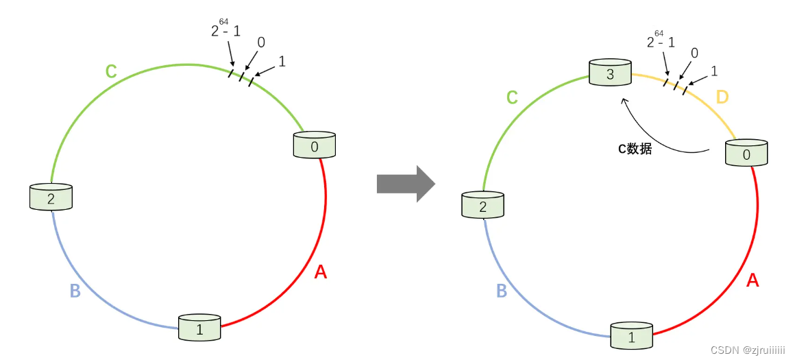 一致性哈希有什么好处?假设此时要加一台服务器,即4台服务器。如下图哈希环所示,在没有添加新数据服务器时,0号数据服务器存储哈希值落在C区域的数据,1号数据服务器存储哈希值落在A区域的数据,2号数据服务器存储哈希值落在B区域的数据。当集群中添加一个新数据服务器3号,那么仅需要0号数据服务器将C区域的数据迁移到3号数据服务器上即可,大大降低了添加 / 减少数据服务器时数据迁移的代价。如: