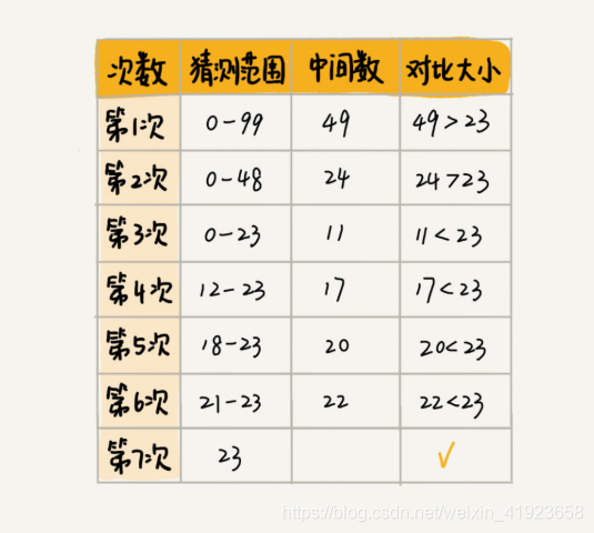 假设写出的数字是23,你可以按照下面的步骤来试一试。(如果猜测范围的数字有偶数个,中间数有两个,就选择较小的那个)。