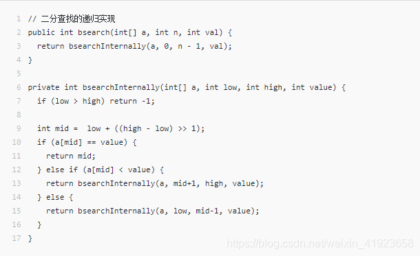 注意是low<=high,而不是low 2、mid的取值 实际上,mid=(low+high)/2这种写法是有问题的。因为如果low和high比较大的话,两者之和就有可能会溢出。改进的地方是将mid的计算方式写成low+(high-low)>>1)。因为相比除法运算来说,计算机处理位运算要快得多。 3、low和high的更新 Low=mid+1,high=mid-1。注意这里+1和-1,如果直接写成low=mid或者high=mid,就可能发生死循环。比如,当high=3,low=3时,如果a[3]不等于value,就会导致一直循环不退出。 实际上二分查找除了循环来实现,还可以用递归来实现。代码如下 二分查找应用场景的局限性 (1)、二分查找依赖的是顺序表结构,简单点说就是数组 二分法查找算法需要按照下标随机访问元素,只能用在数据通过顺序表来储存的数据结构上。如果数据是通过其他数据结构存储的,则无法应用二分查找。 (2)、二分查找针对的是有序数据 二分查找要求数据必须是有序,主要适用于一组静态的数据,没有频繁地插入、删除,我们就可以进行一次排序,多次二分查找的场景中。 (3)、数据量太小不适合二分查找 如果处理的数据量很小,完全没有必要用二分查找,顺序遍历就足够了。不过如果数据间的比较操作非常耗时,不管数据量的大小,使用二分法查找比较合适。 (4)、数据量太大也不适合二分法查找 二分法的底层需要依赖数组这种数据结构,而数组为了支持随机访问的特性,要求内存空间连续,对内存的要求比较苛刻。 二分法查找是作用在数组这种结构之上的,所以太大的数据用数组存储就比较吃力,也就不用二分查找了。 Q:如何在1000万个整数中快速查找某个整数? 假设我们的内存限制是100MB,每个数据大小是8字节,最简单的办法是将数据存储在数组中,内存占用差不多是80MB,符合内存的限制。借助今天学习的内容,我们可以先对这1000万数据从小到大排序,然后利用二分查找算法,就可以快速地查找想要的数据。 扫码关注微信公众号,欢迎技术交流,其中含有大量免费的人工智能、图像处理、IT资料: