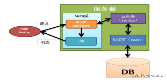 页面发送请求给控制器,控制器调用业务层处理逻辑,逻辑层向持久层发送请求,持久层与数据库交互,后将结果返回给业务层,业务层将处理逻辑发送给控制器,控制器再调用视图展现数据。