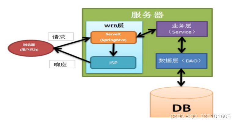 页面发送请求给控制器,控制器调用业务层处理逻辑,逻辑层向持久层发送请求,持久层与数据库交互,后将结果返回给业务层,业务层将处理逻辑发送给控制器,控制器再调用视图展现数据。