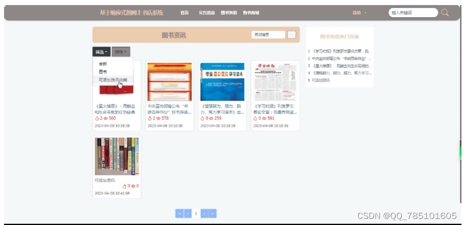 本文针对响应式的网上书店系统的特点和用户需求,利用 Java相关技术、SSM框架和等技术,通过详细的需求分析、页面设计和功能设计,系统利用JQuery 技术和 CSS 技术进行了页面设计,实现了包括用户模块、商城模块、图书资讯模块、书籍购买模块的前台系统以及包括用户管理模块、资讯管理模块、订单管理模块的后台系统。
