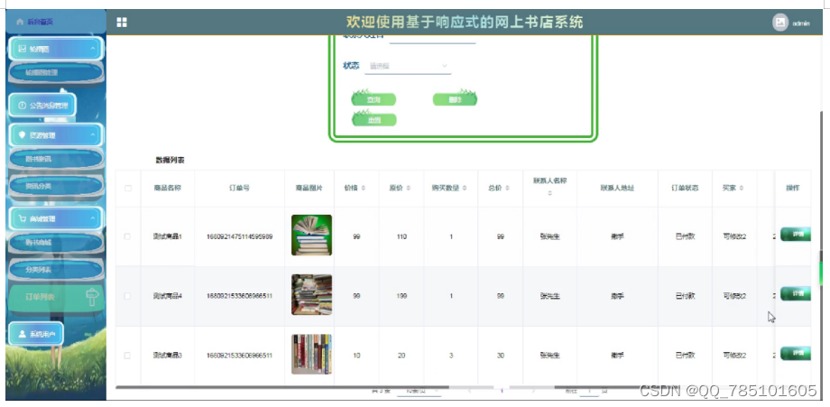 (3)购书商城模块:主要包括书本信息、用户可以进行书名、分类等进行搜索可以进行购买支付等功能。