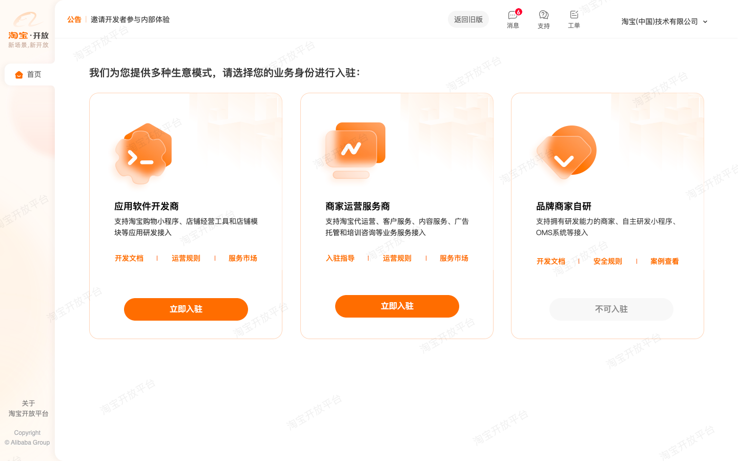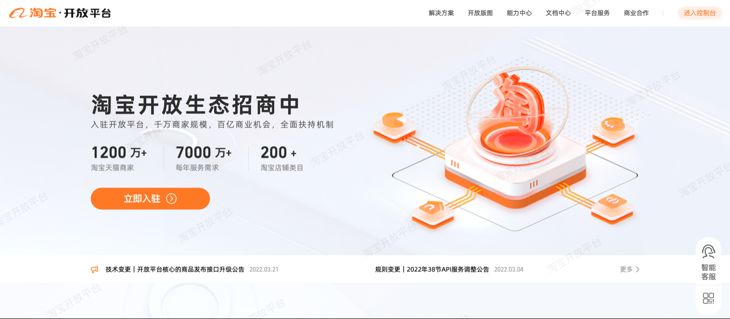 第一步:打开淘宝开放平台官网首页。您可以在官网了解平台最新重点开放的业务类型、开放能力、支持商业化售卖模式,以及各开放业务入驻规则和流程等信息,然后点击“立即入驻”进行伙伴工作台