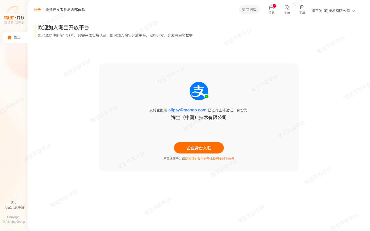 第二步:登陆淘宝账号,完成“实名认证”。请先完成”登陆淘宝账号”对应的“支付宝账号”绑定,然后点击“企业身份入驻”进行身份选择。备注:绑定的支付宝需与登陆淘宝账号注册支付宝一致。