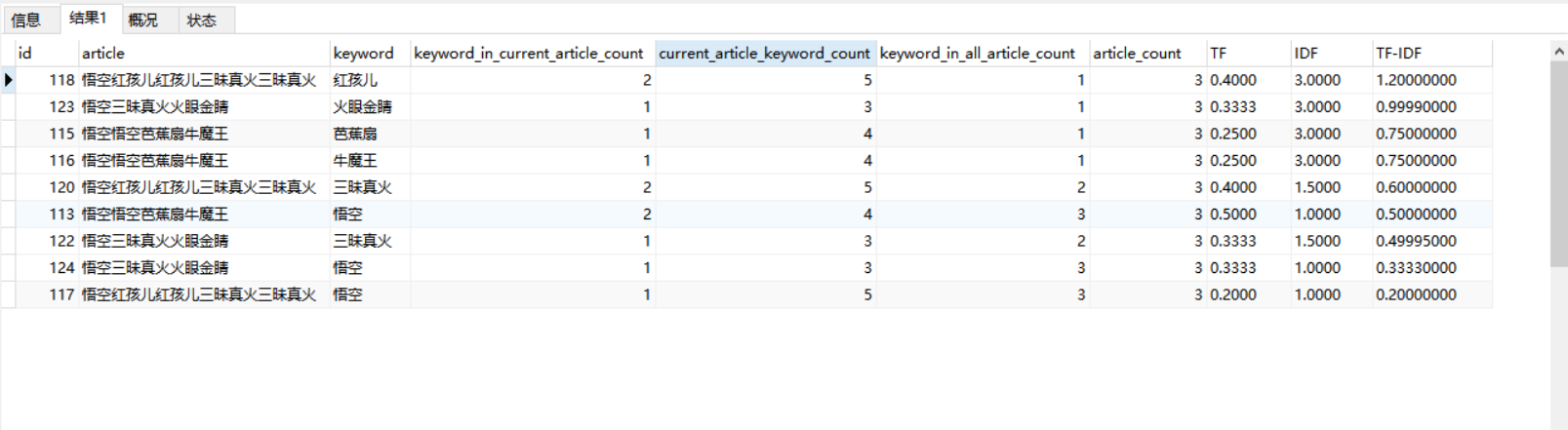 SELECT * FROM (#计算TF-IDF的值SELECT *,(TF * IDF)as 'TF-IDF' FROM (#分别计算TF和IDF的值SELECT *,(keyword_in_current_article_count / current_article_keyword_count) as TF,(article_count / keyword_in_all_article_count) as IDF FROM(#查询表中数据以及联查计算TF-IDF所需的各种聚合值以及直接聚合文章总数量的值SELECT article_keywords.*,keyword_in_current_article_count.keyword_in_current_article_count,current_article_keyword_count.current_article_keyword_count,keyword_in_all_article_count.keyword_in_all_article_count,(SELECT COUNT(1) FROM (SELECT article FROM article_keywords GROUP BY article) as a)as article_count FROM article_keywords as article_keywords #联查关键词在当前文章中出现的频率的聚合表LEFT JOIN (SELECT article,keyword,COUNT(1) as keyword_in_current_article_count FROM article_keywords GROUP BY article,keyword)as keyword_in_current_article_countON article_keywords.article = keyword_in_current_article_count.article AND article_keywords.keyword = keyword_in_current_article_count.keyword#联查当前文章中所有关键词的个数的聚合表LEFT JOIN (SELECT article,COUNT(keyword) as current_article_keyword_count FROM article_keywords GROUP BY article) as current_article_keyword_countON article_keywords.article = current_article_keyword_count.article#联查出现此关键词的文章个数的聚合表LEFT JOIN (SELECT a.keyword as keyword,COUNT(article) keyword_in_all_article_count FROM (SELECT article,keyword FROM article_keywords GROUP BY article,keyword)as a GROUP BY a.keyword)as keyword_in_all_article_countON article_keywords.keyword = keyword_in_all_article_count.keyword) as article_keywords_tf_idf) as article_keywords_tfidf