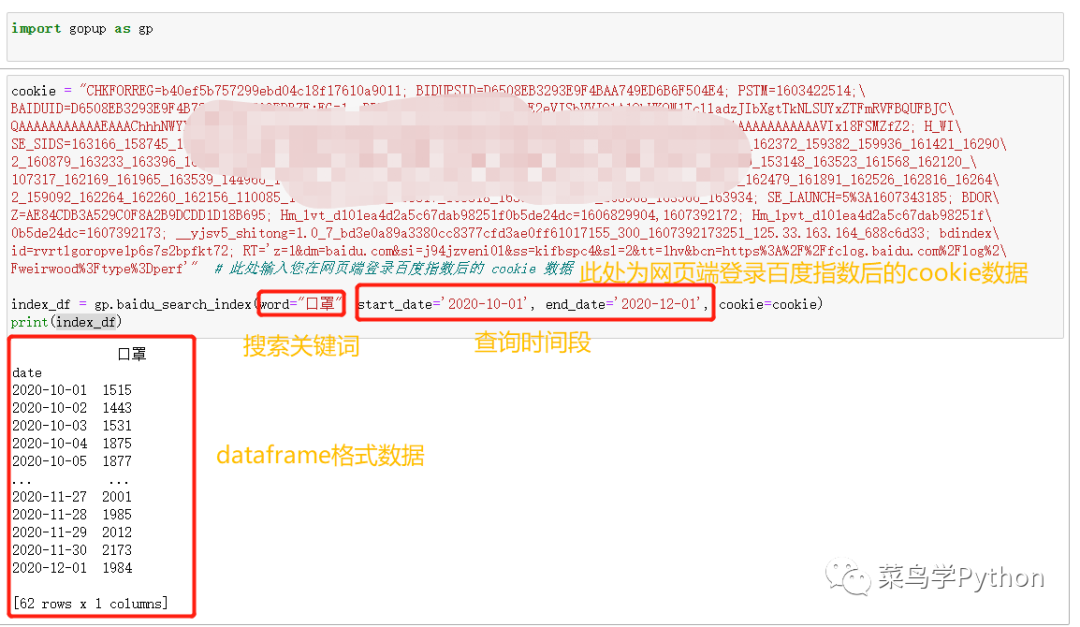 上图中,可以看到,首先我们需要先在网页端登录百度指数,然后获取 cookie 数据,拿到 cookie 数据后,就可以调用 gopup 库的 baidu_search_index 函数来查询指定时间段内的指定关键词的搜索热度。这里我们搜索的就是 2020 年 10 月 1 号到 2020 年 12 月 1 号的 62 天的 “口罩” 搜索指数。返回的是 DataFrame 格式的数据。那么如何获得 cookie 呢?