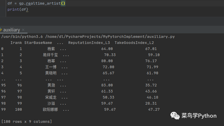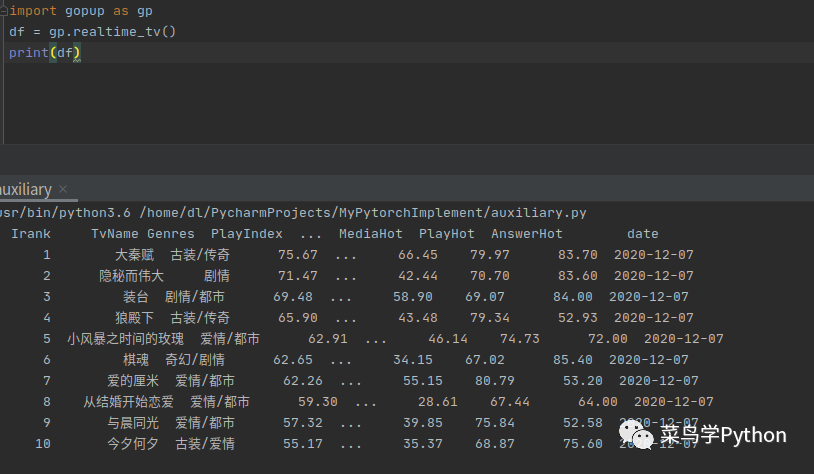 gopup 不仅仅可以抓取到生活信息,还可以帮助我们抓取影视信息方面的数据,例如实时的电影票房数据、实时电视剧播映指数、艺人商业价值等信息,程序和结果如下图所示: