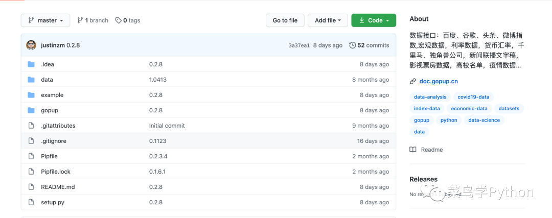 ”对于做爬虫和数据分析方向的小伙伴来说,对于数据的获取是十分重要的,尤其是关于大数据分析的数据,非常难以获取,最近小编在浏览 Github 时,就发现了一个宝库——gopup。是由一个国内的大神开源的python库,该库包含了大量的大数据分析相关的数据,一起来看看吧。