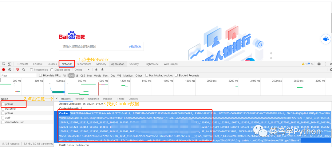 首先打开百度指数网站并登录,然后点击 F12 进入开发者模式后,点击 Network 后,点击任意一个 url 的链接,翻到最下方就可以获取到 cookie 数据。